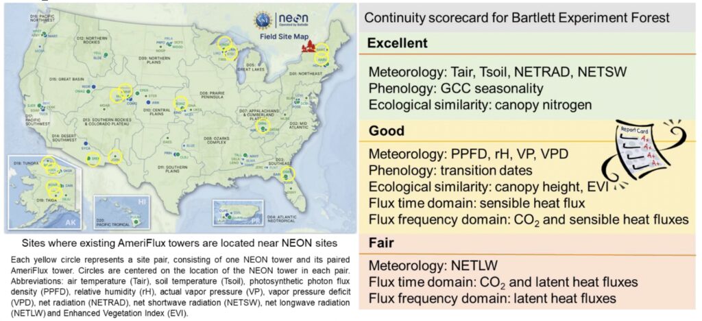 Yujie’s paper, “A tale of two towers: comparing NEON and AmeriFlux data streams at Bartlett Experimental Forest,” has just been published in Agricultural and Forest Meteorology. The two towers are separated by less than 100 m, but although meteorology and phenology data show good agreement between AmeriFlux and NEON, and although the agreement is reasonably between measured fluxes of carbon dioxide, latent heat, and sensible heat at the half hourly time scale, Yujie’s analysis shows that the carbon dioxide and latent heat fluxes are in poor agreement at the annual scale. For example, annual C balance differs by over 120 g C m-2 y-1 between the two towers, and patterns of inter annual variability are not at all in agreement.
