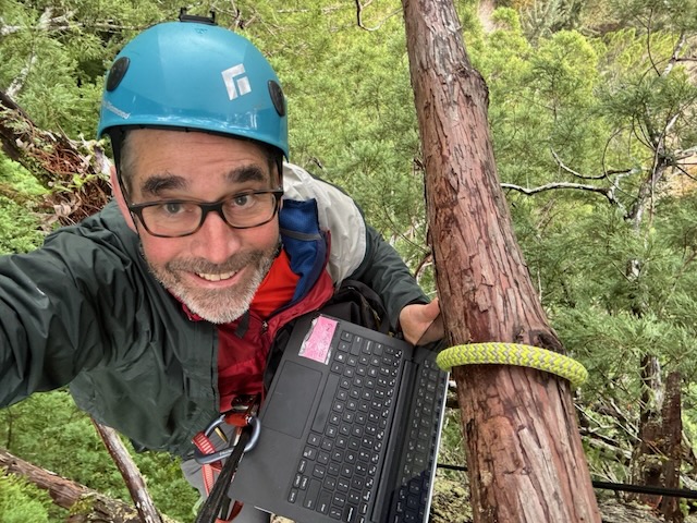 The photos show Andrew somewhere in Tree 51, and George playing Tetris with a dozen dendrometers.