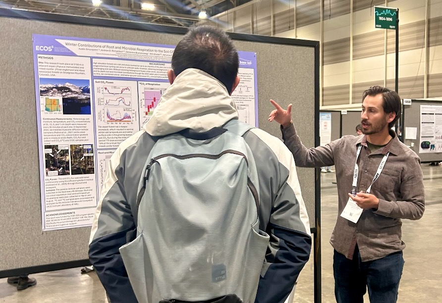 Highlights included a poster presentation by Austin titled “Winter Contributions of Root and Microbial Respiration to the Soil CO2 Flux in Mixed-Conifer and Aspen Forests,” a talk by Jen titled “Is Your Thermal Camera Telling the Truth? Assessing Measurement Accuracy for Ecosystem Science,” and a talk by Darby titled “Increasing Respiration Weakens the Carbon Sink over Two Decades in a Temperate Deciduous Forest.”
