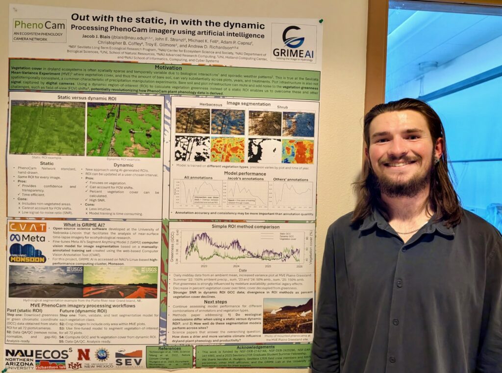 Jacob attended the meeting and presented a poster on a new PhenoCam data processing workflow he is building, which uses the GRIME AI open source software to separate vegetation from bare soil in hundreds of thousands of PhenoCam images from the SEV Mean-Variance Experiment. The questions Jacob is investigating are: 1) does processing images using dynamic masks that separate vegetation and soil improve results compared to static masks that include both vegetation and soil? 2) how well does an AI-based image segmentation model trained on data from one study extrapolate to other study sites?